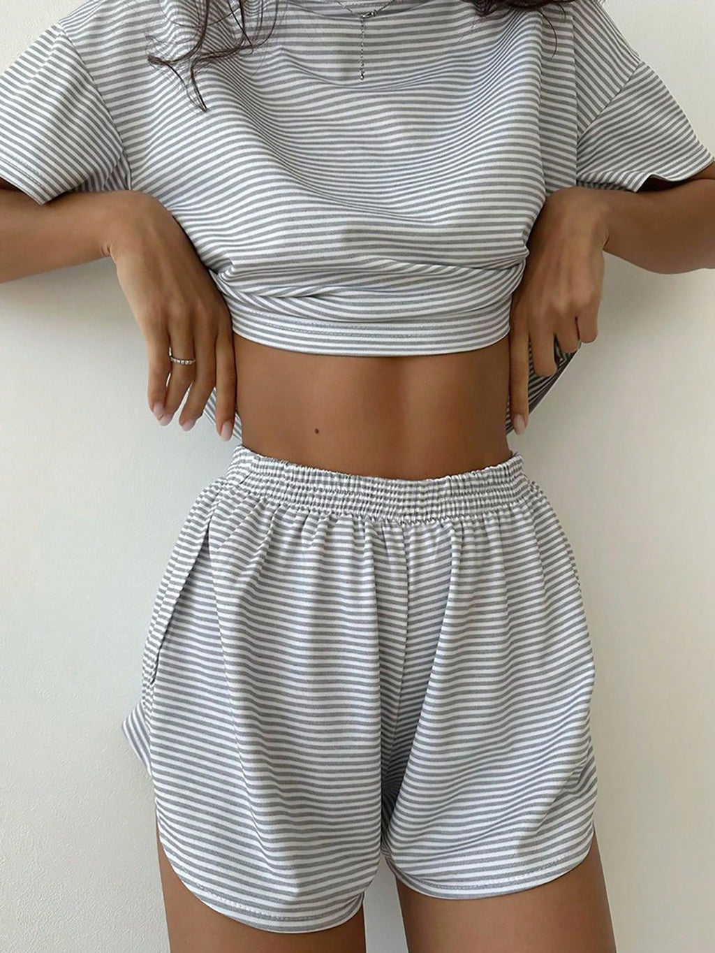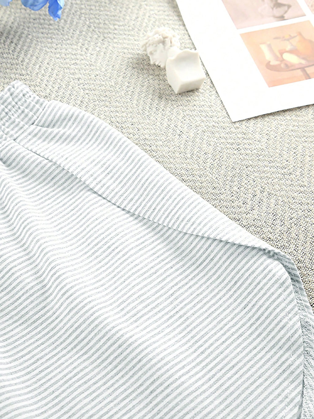 2 Stücke/Set lässig locker sitzende Strickoberteil mit Streifenmuster und Schlitz-Saum, und Shorts für Zuhause, geeignet für den Heimgebrauch, Zweiteiler