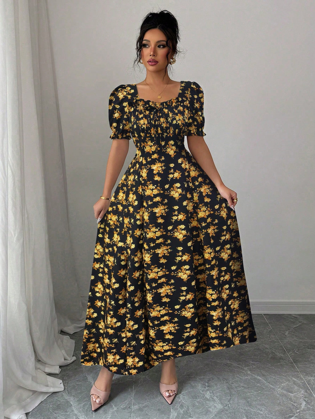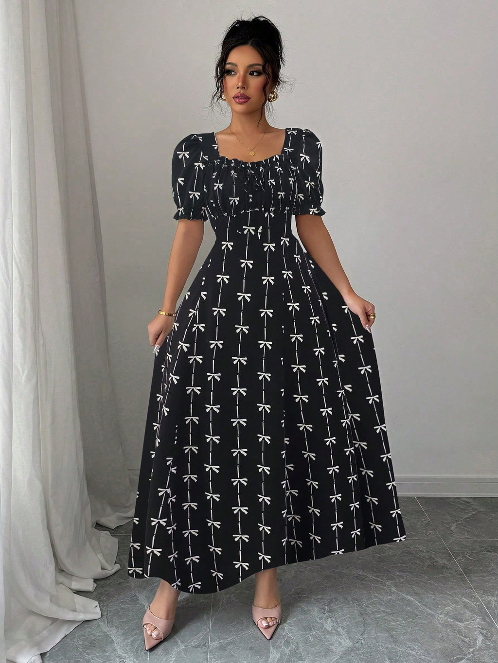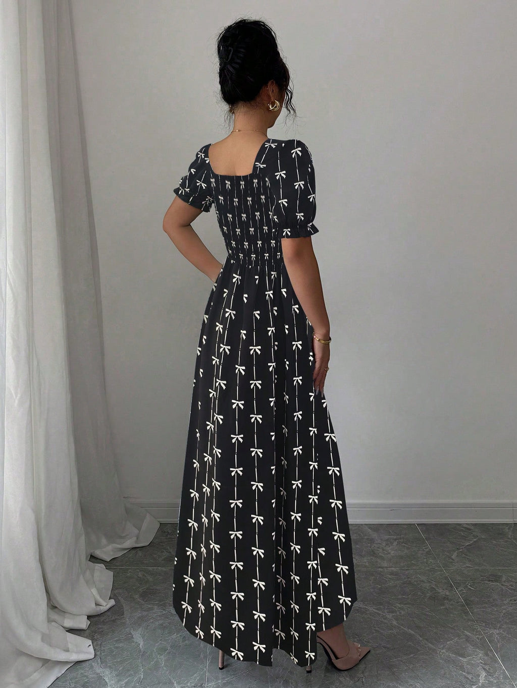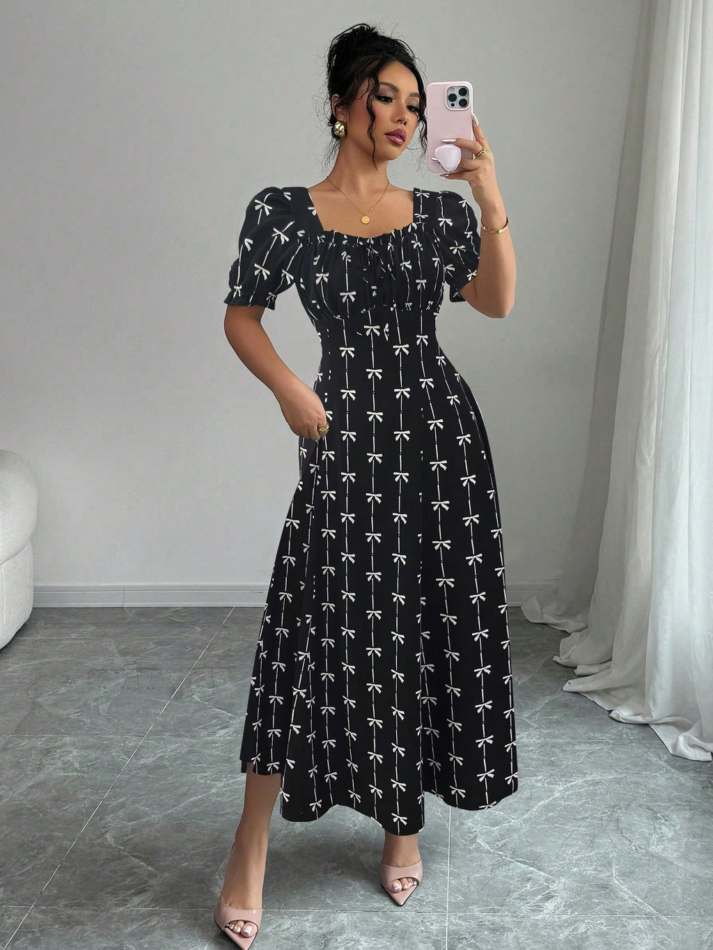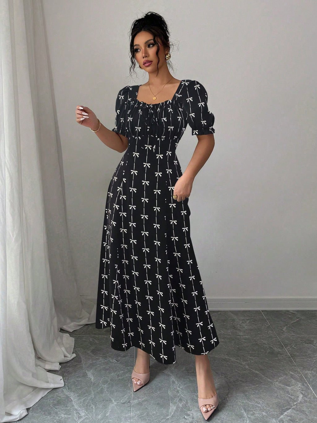 MIU AZRA Ženska Crna Crep Haljina sa Nabranom Ovratnikom i Rukavima u Zvonu