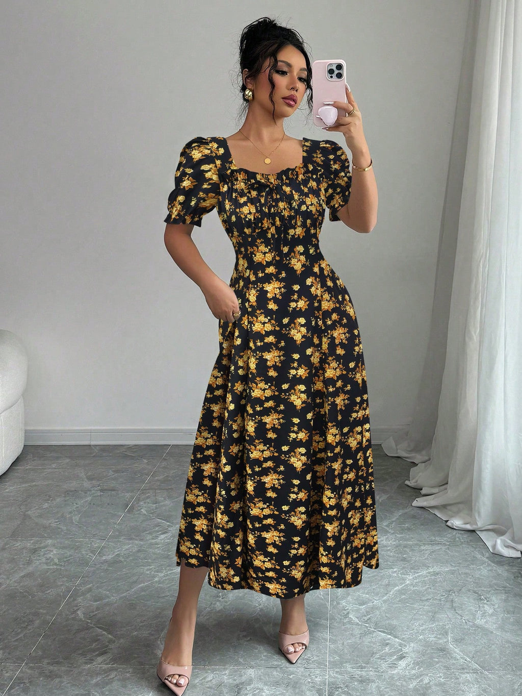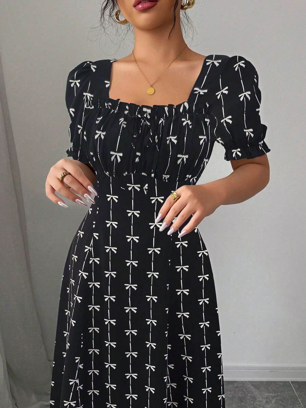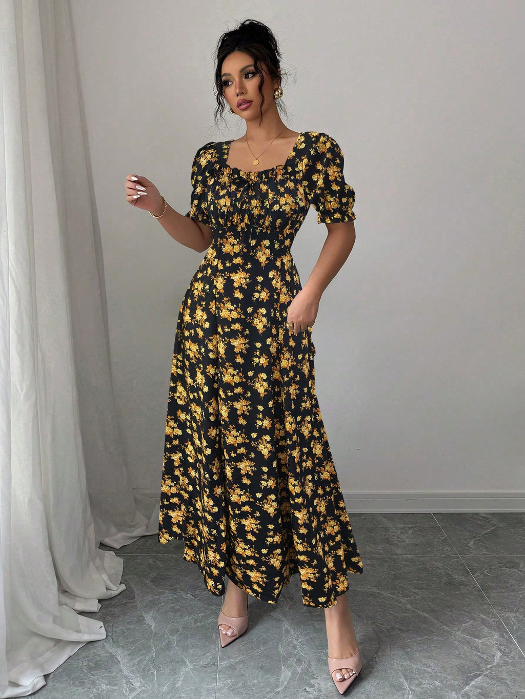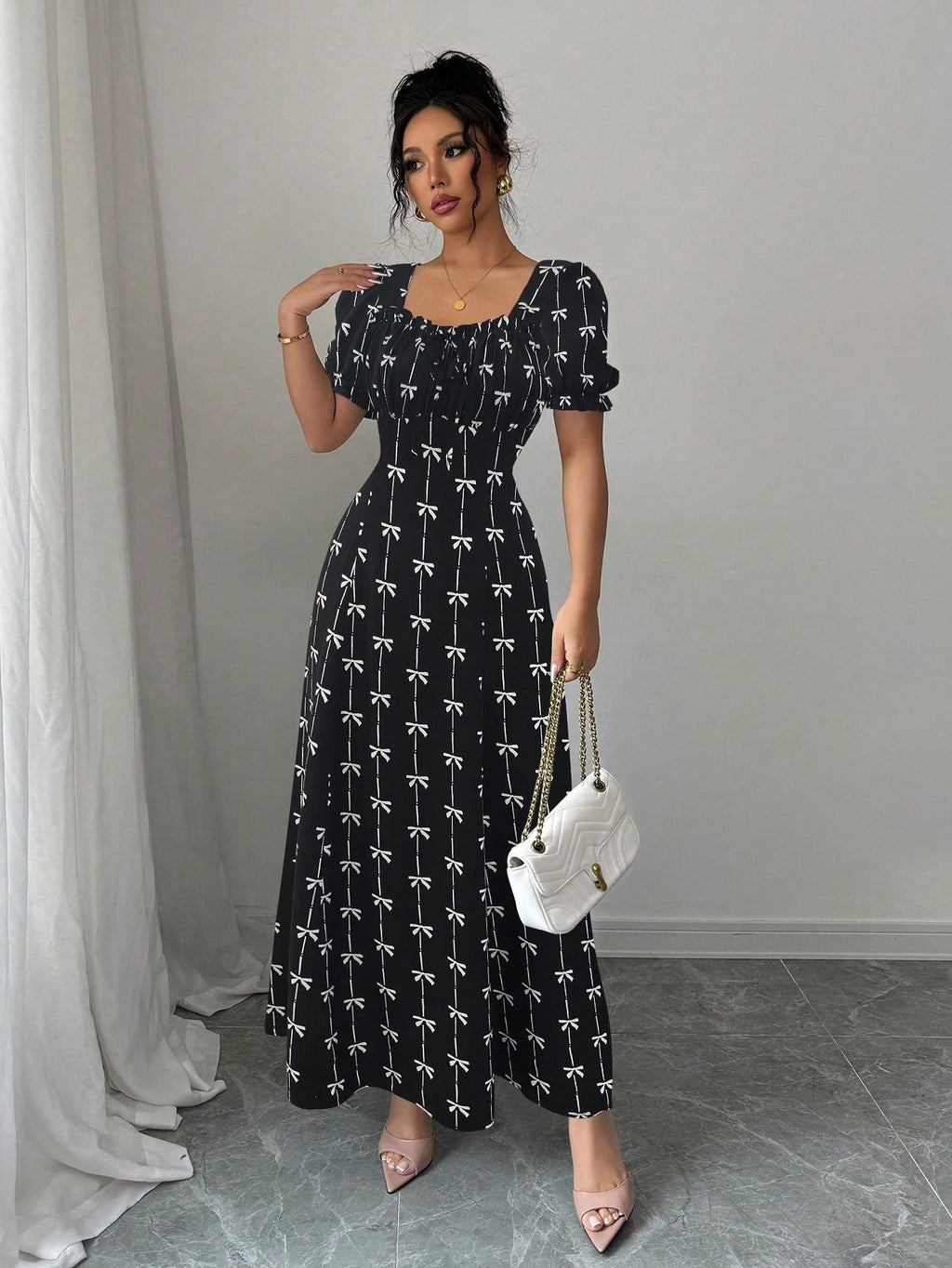 MIU AZRA Ženska Crna Crep Haljina sa Nabranom Ovratnikom i Rukavima u Zvonu