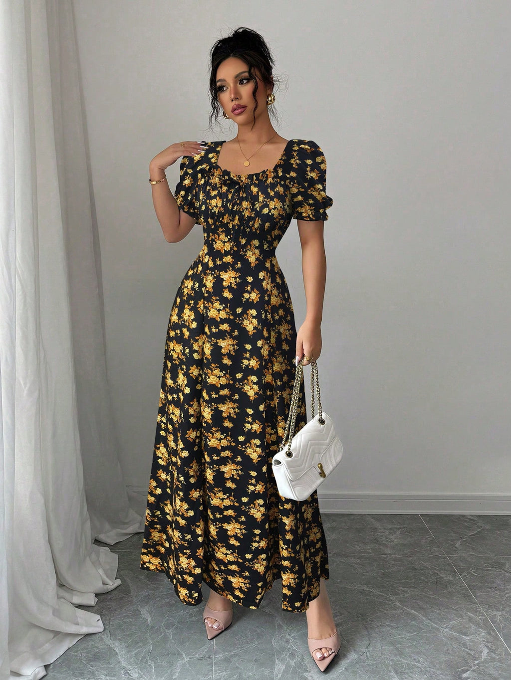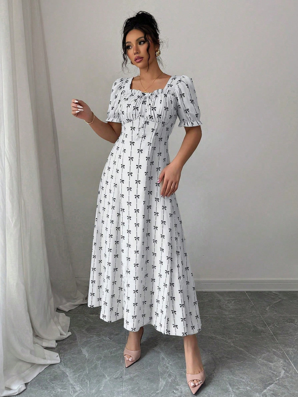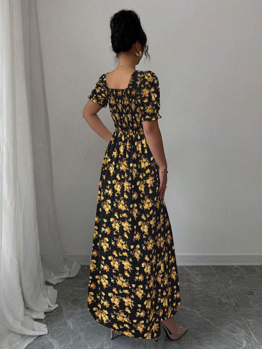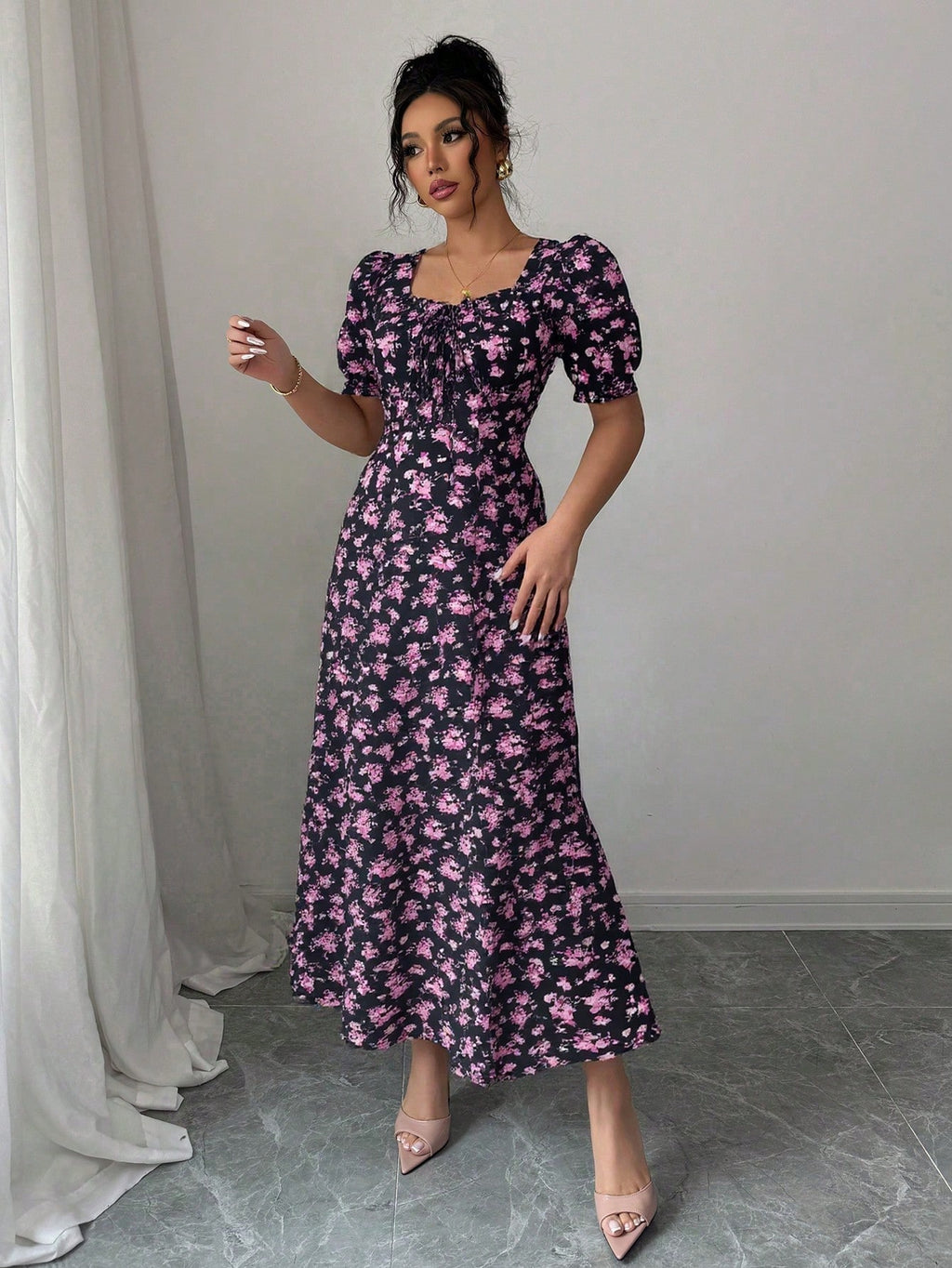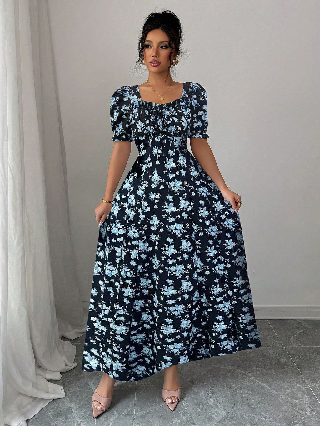 MIU AZRA Ženska Crna Crep Haljina sa Nabranom Ovratnikom i Rukavima u Zvonu