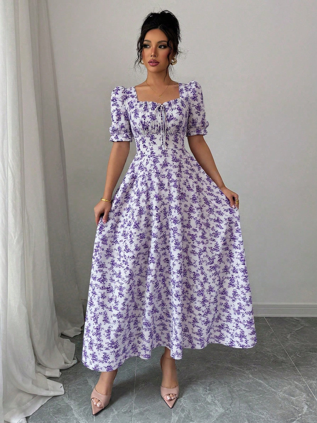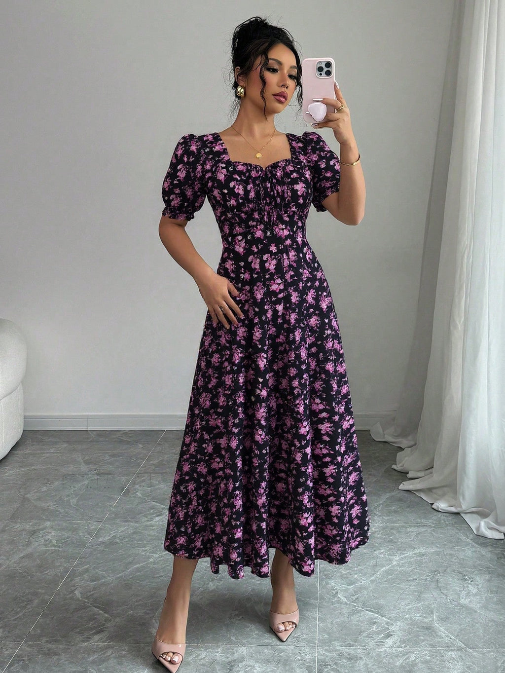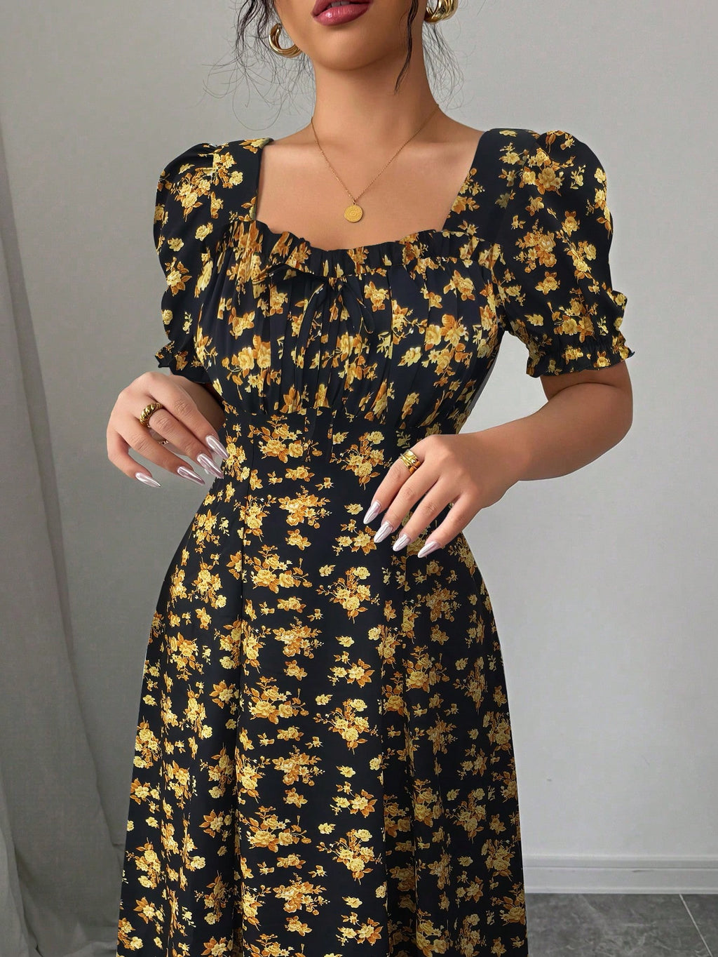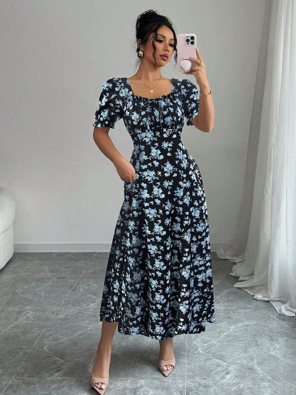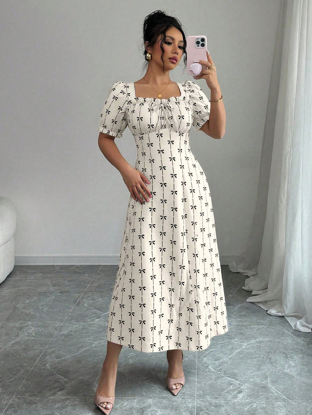 MIU AZRA Ženska Crna Crep Haljina sa Nabranom Ovratnikom i Rukavima u Zvonu