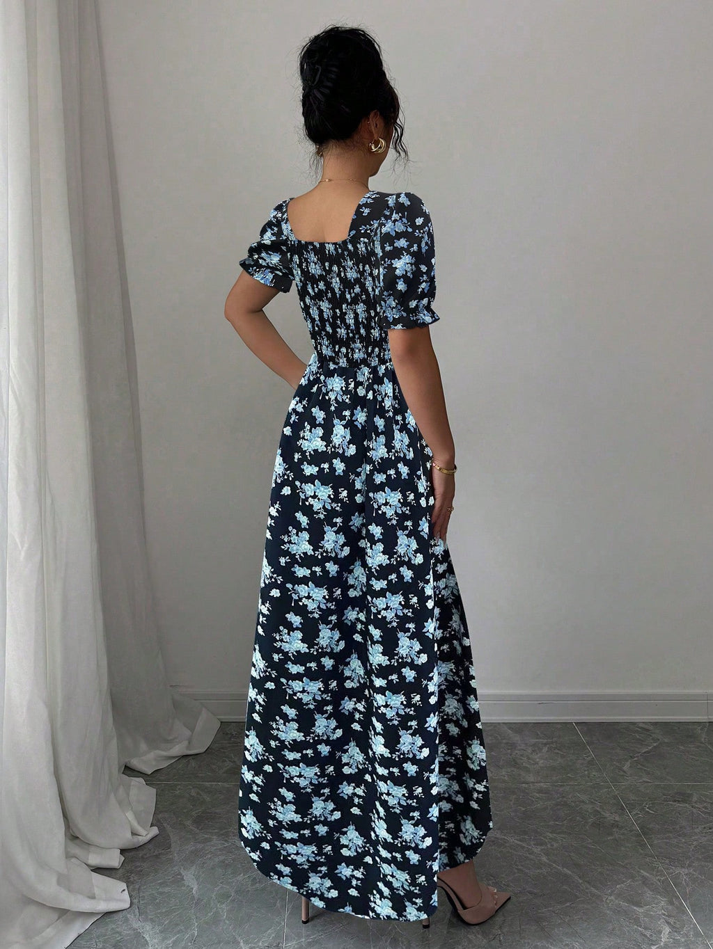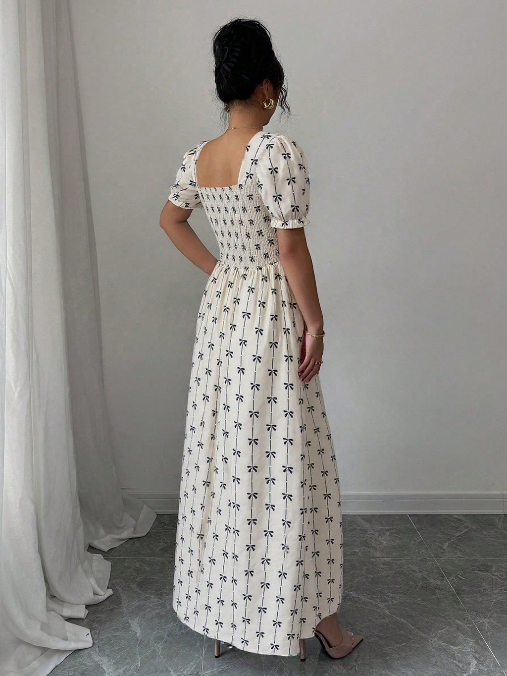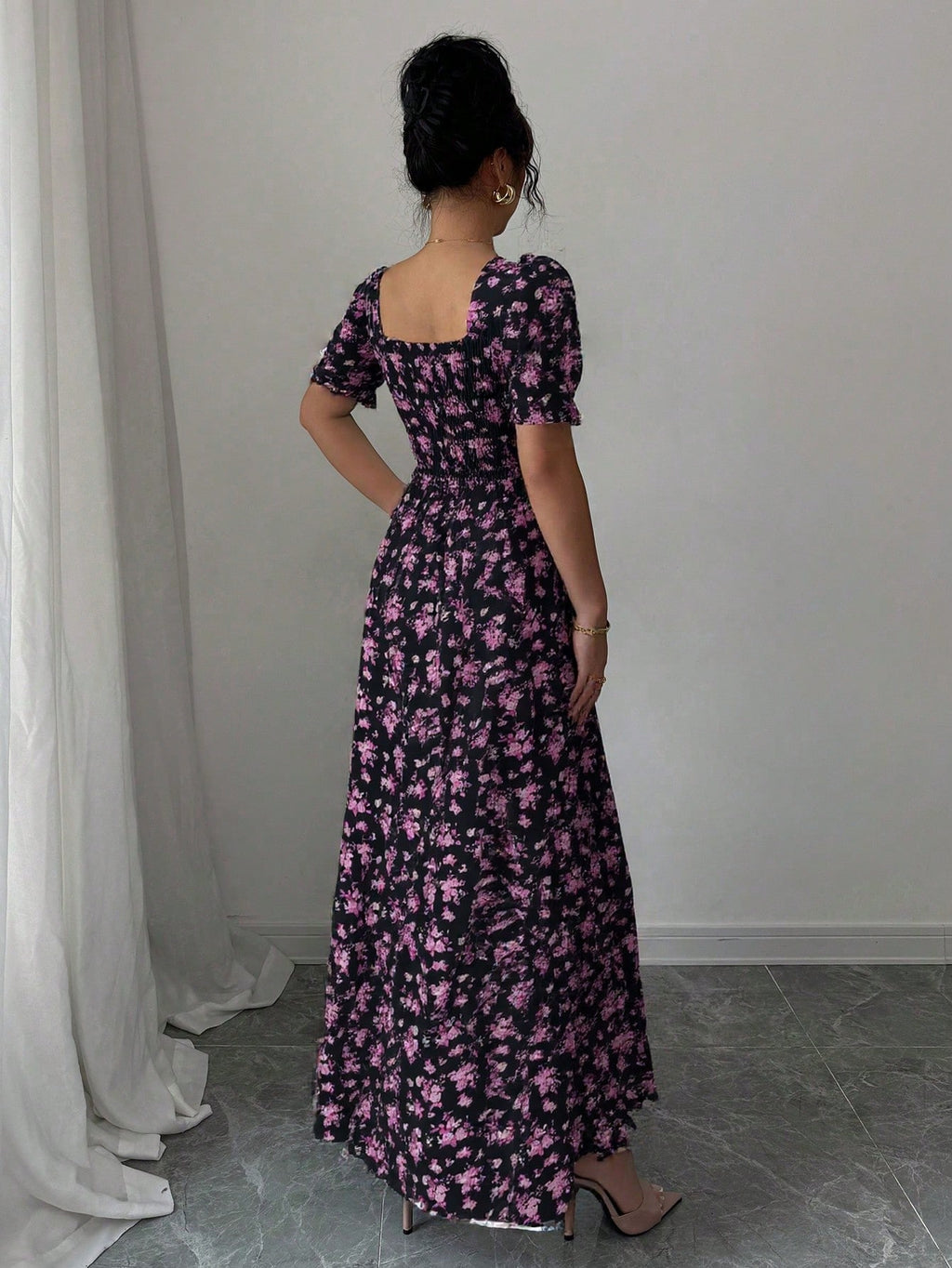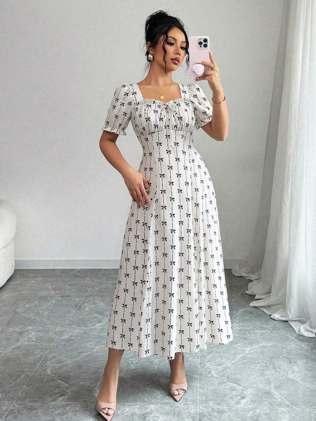 MIU AZRA Ženska Crna Crep Haljina sa Nabranom Ovratnikom i Rukavima u Zvonu