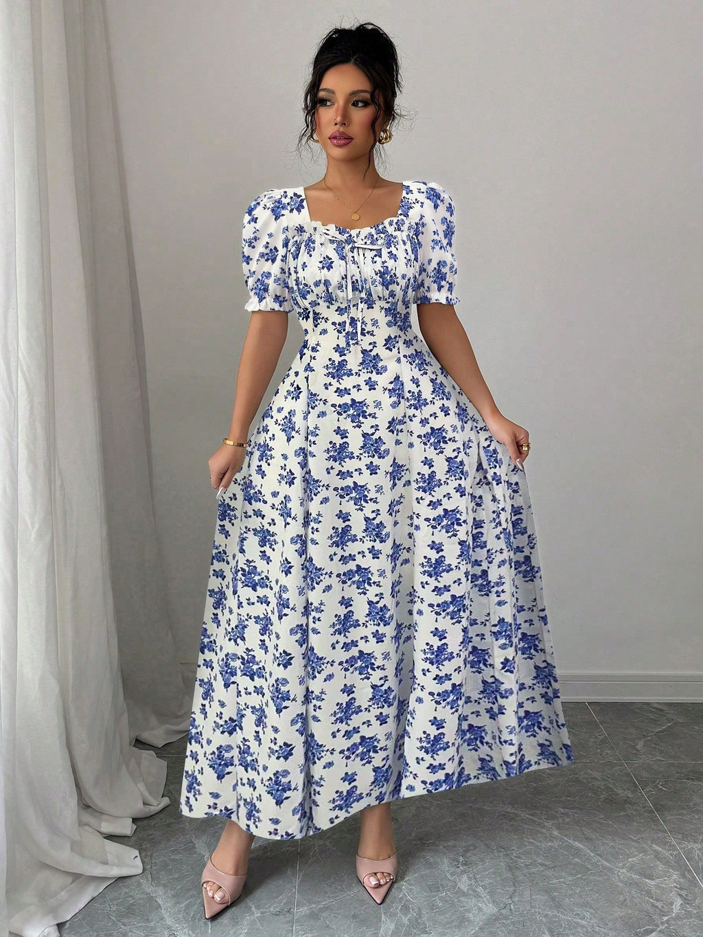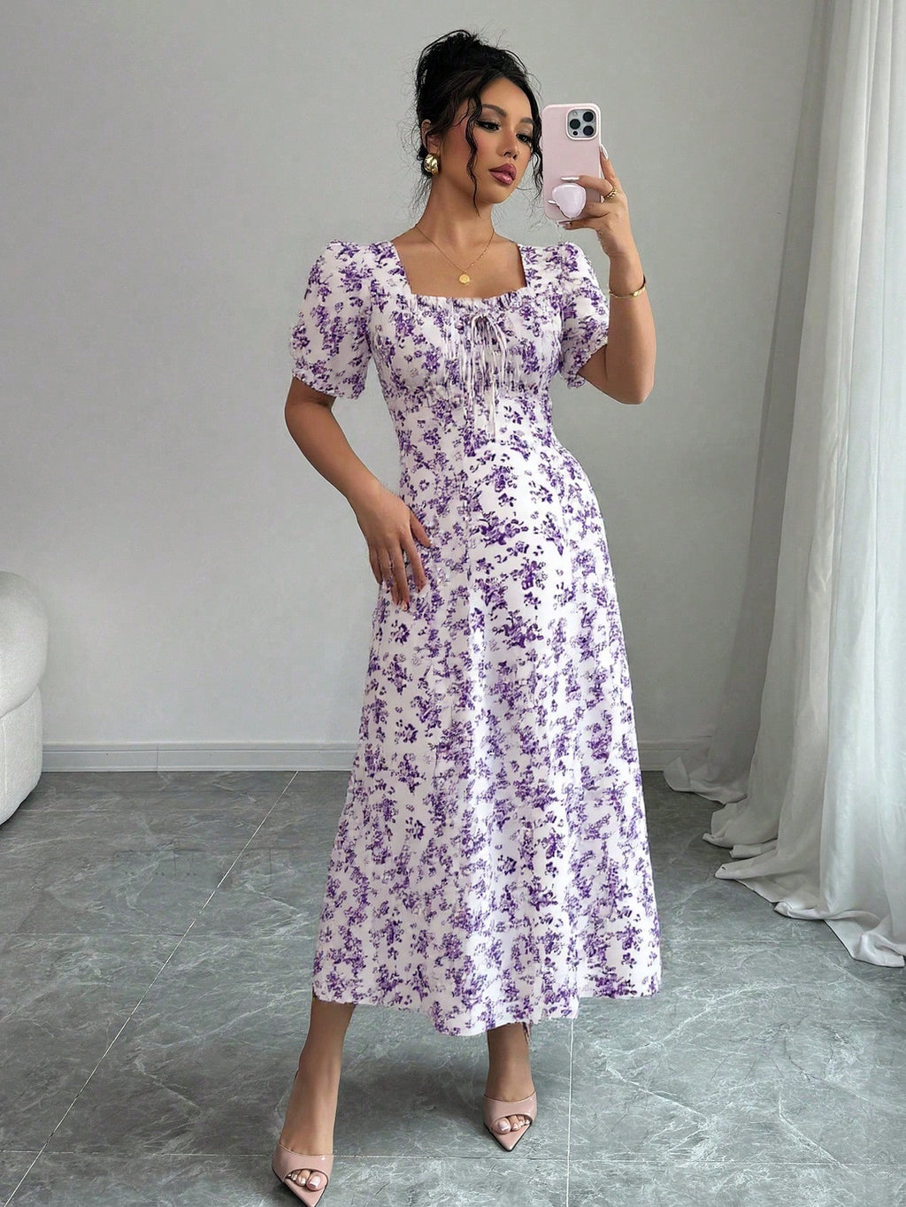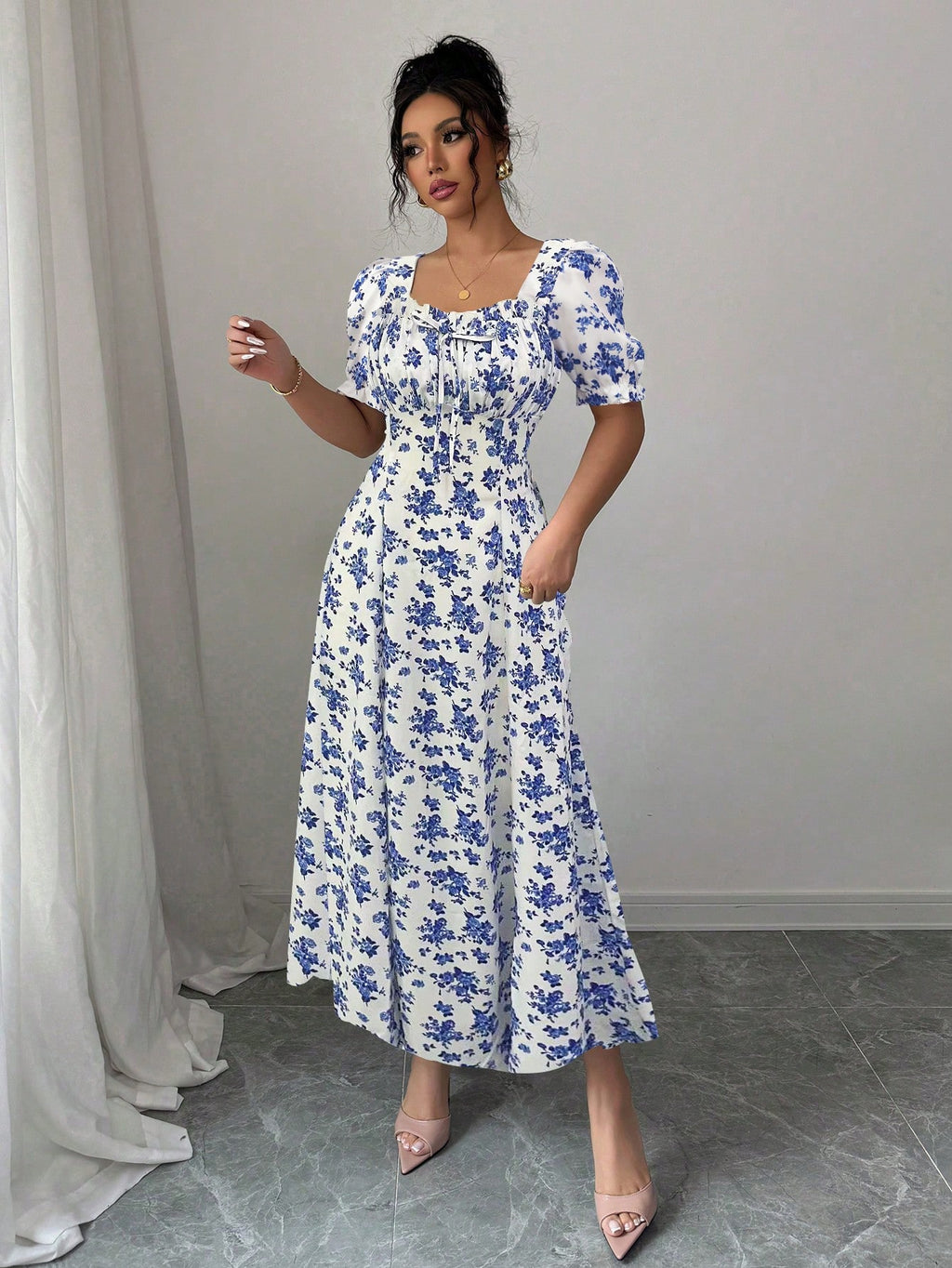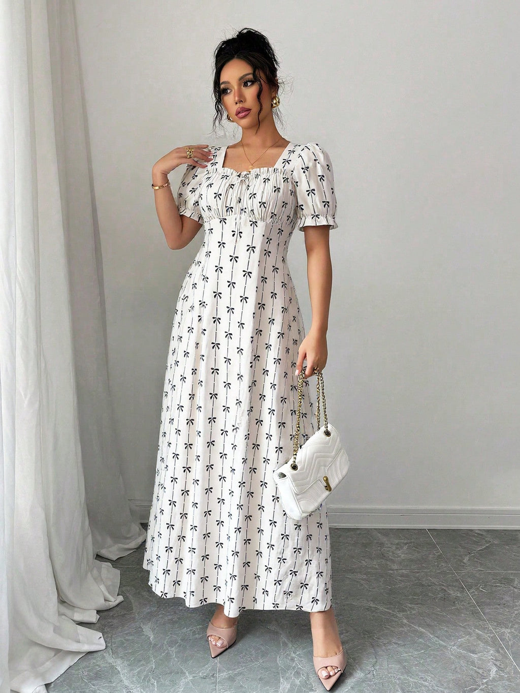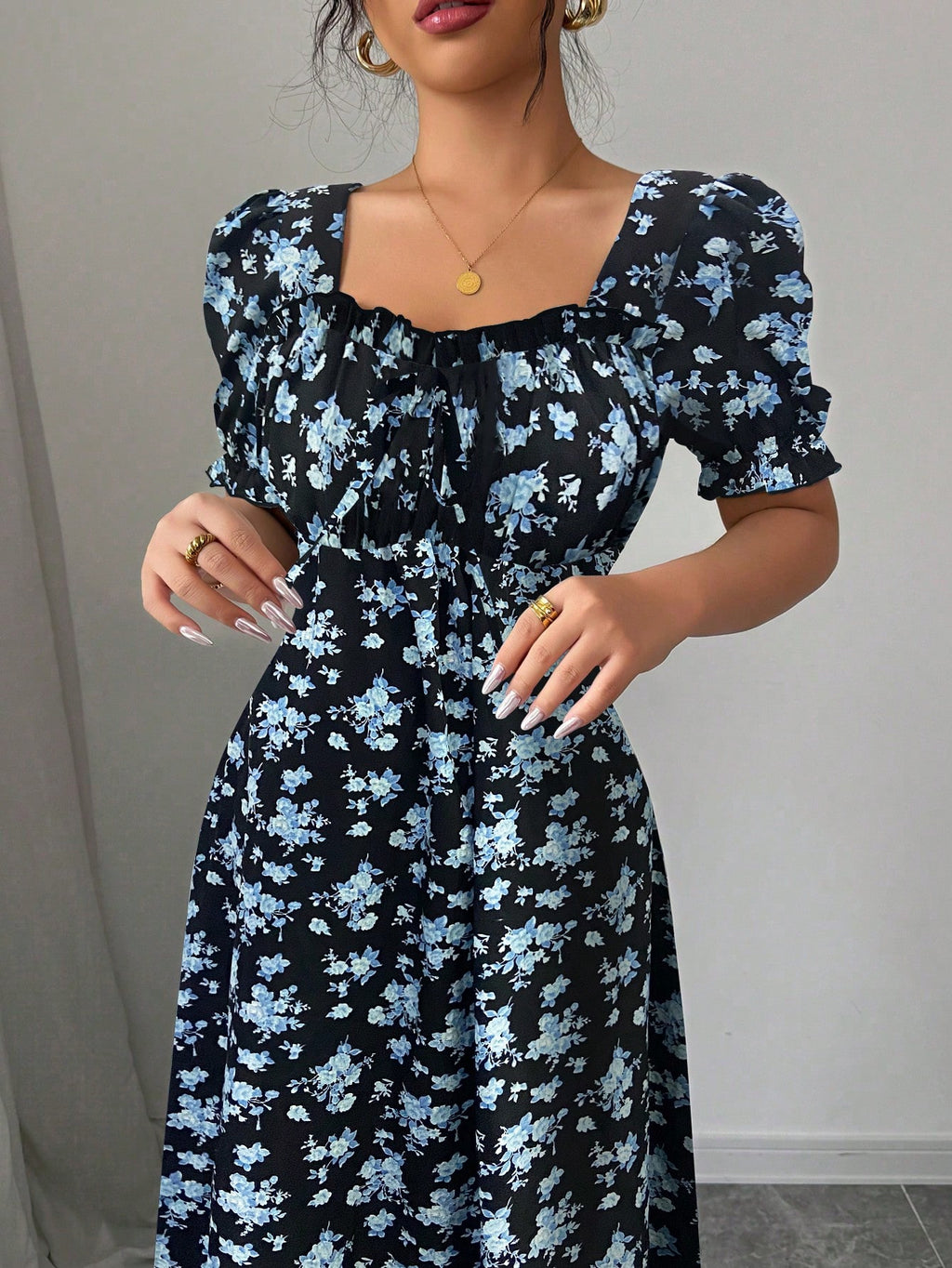 MIU AZRA Ženska Crna Crep Haljina sa Nabranom Ovratnikom i Rukavima u Zvonu