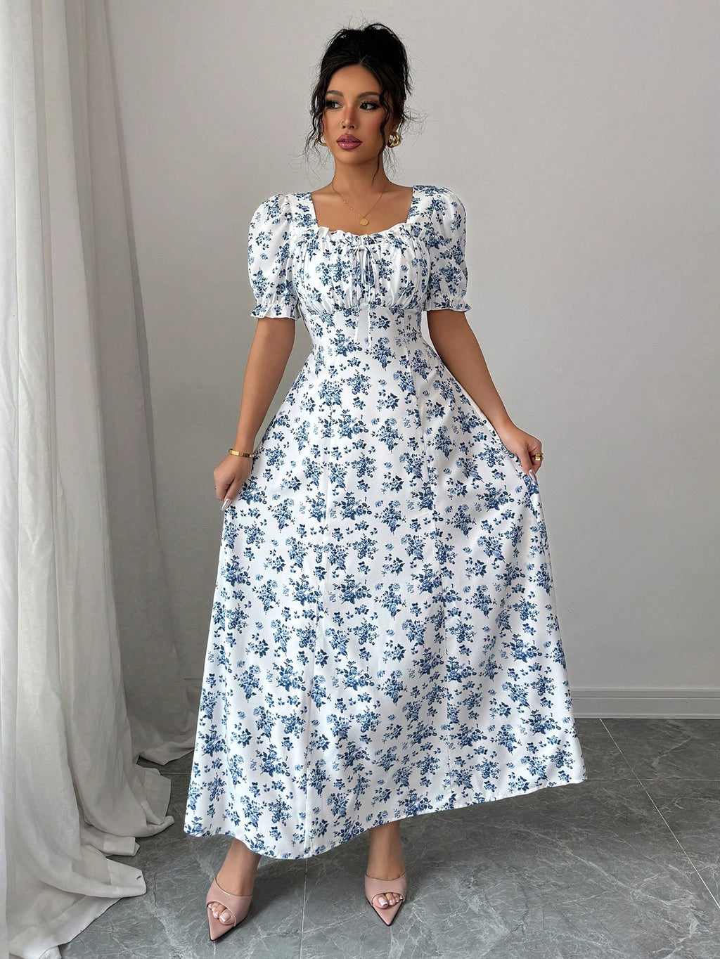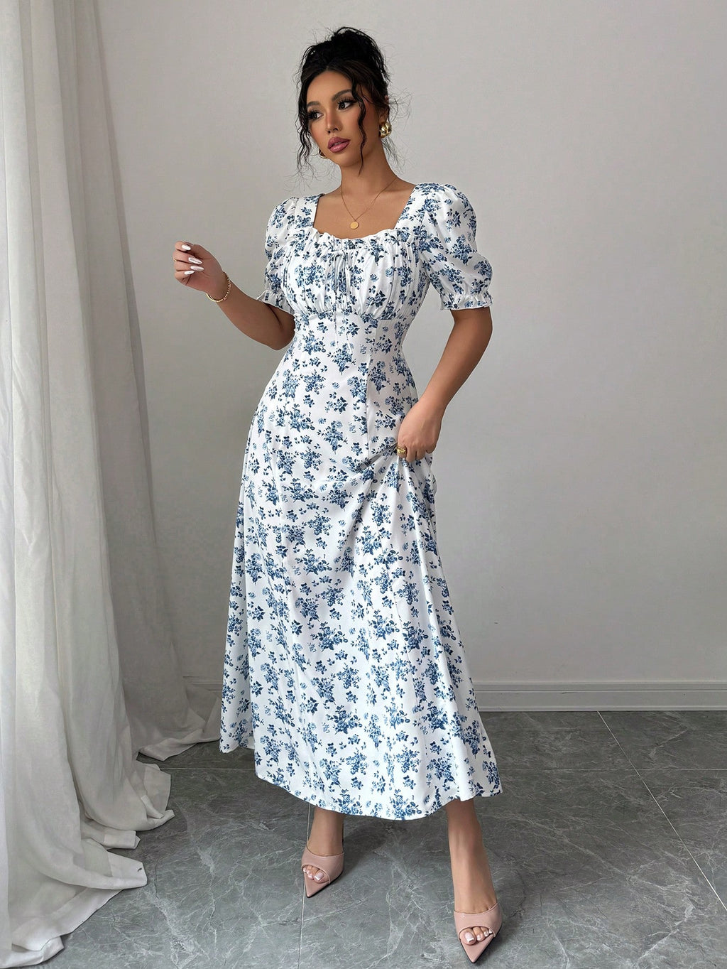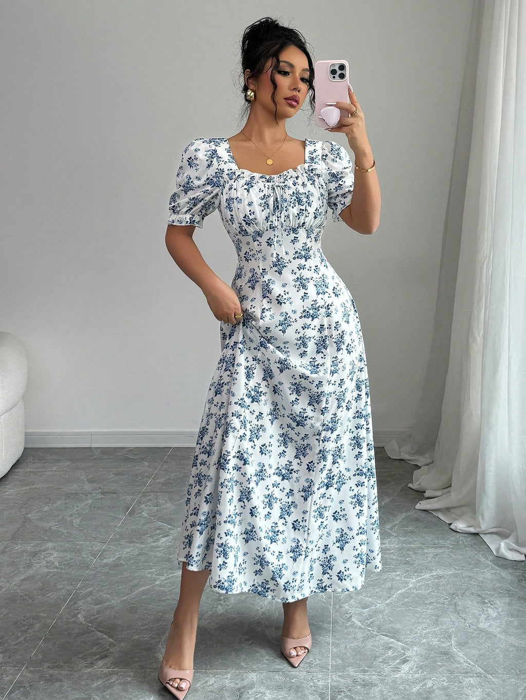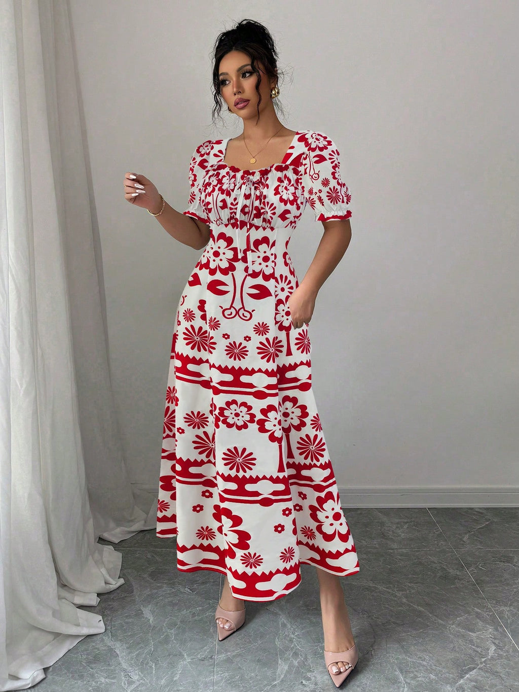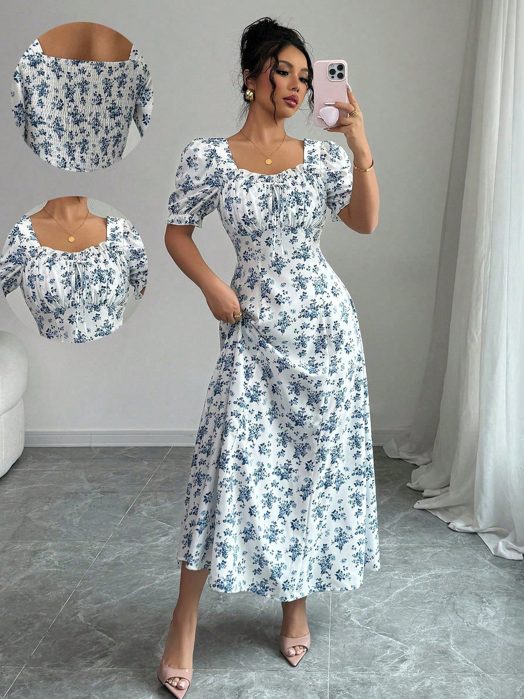 MIU AZRA Ženska Crna Crep Haljina sa Nabranom Ovratnikom i Rukavima u Zvonu