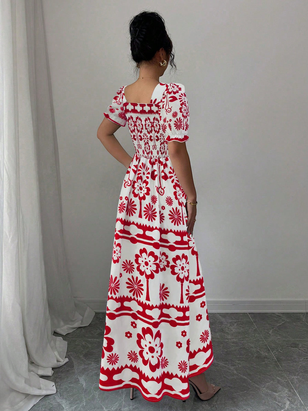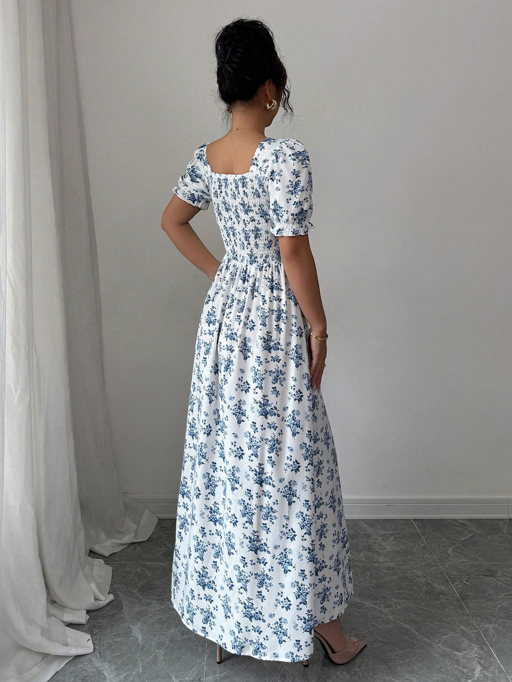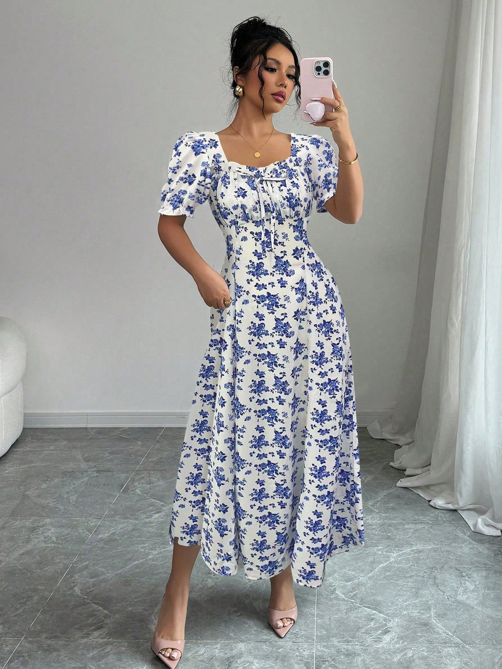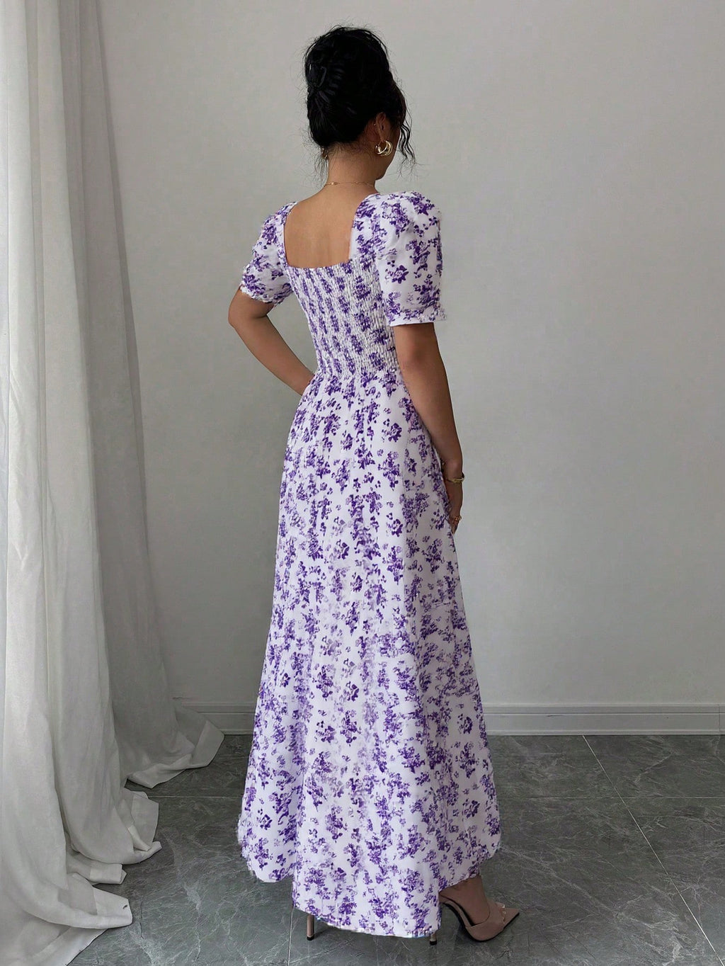 MIU AZRA Ženska Crna Crep Haljina sa Nabranom Ovratnikom i Rukavima u Zvonu