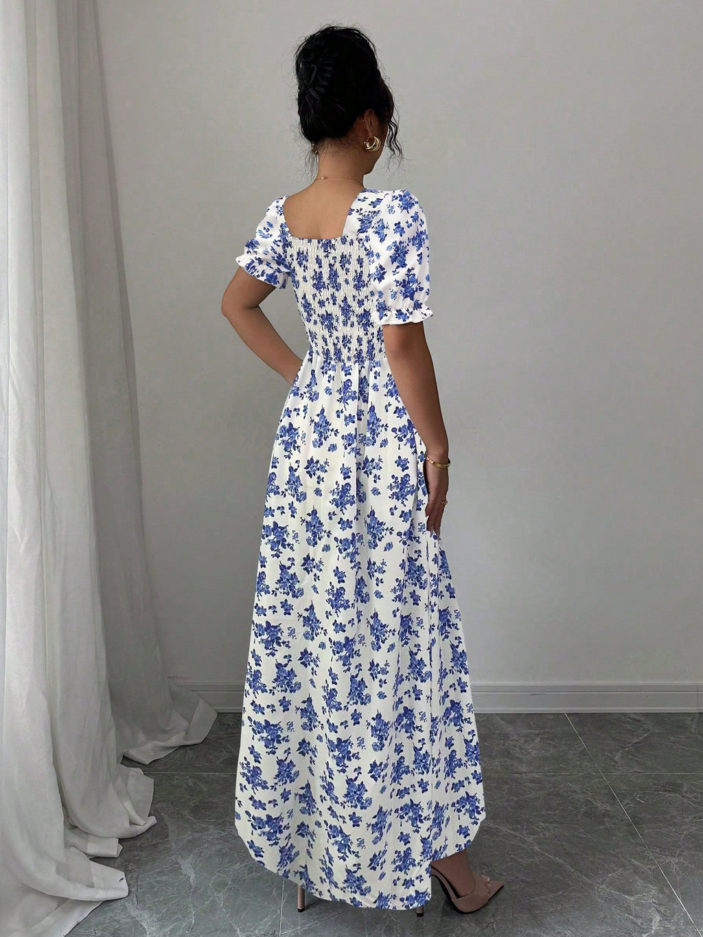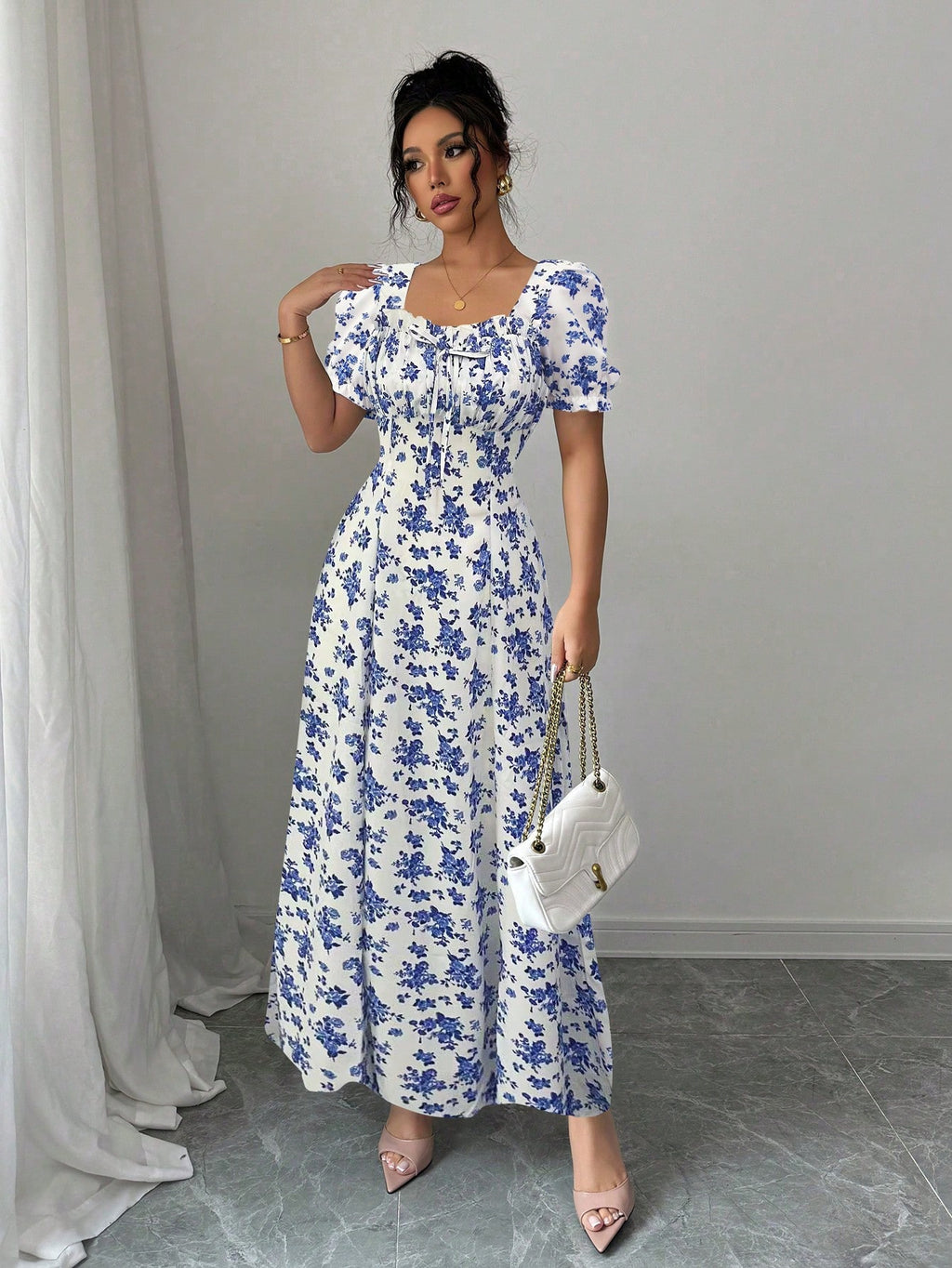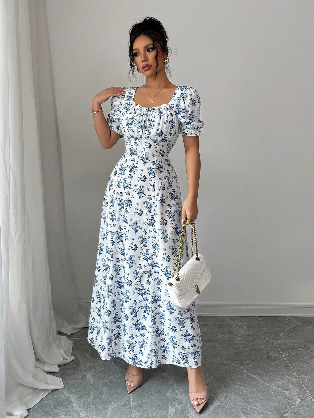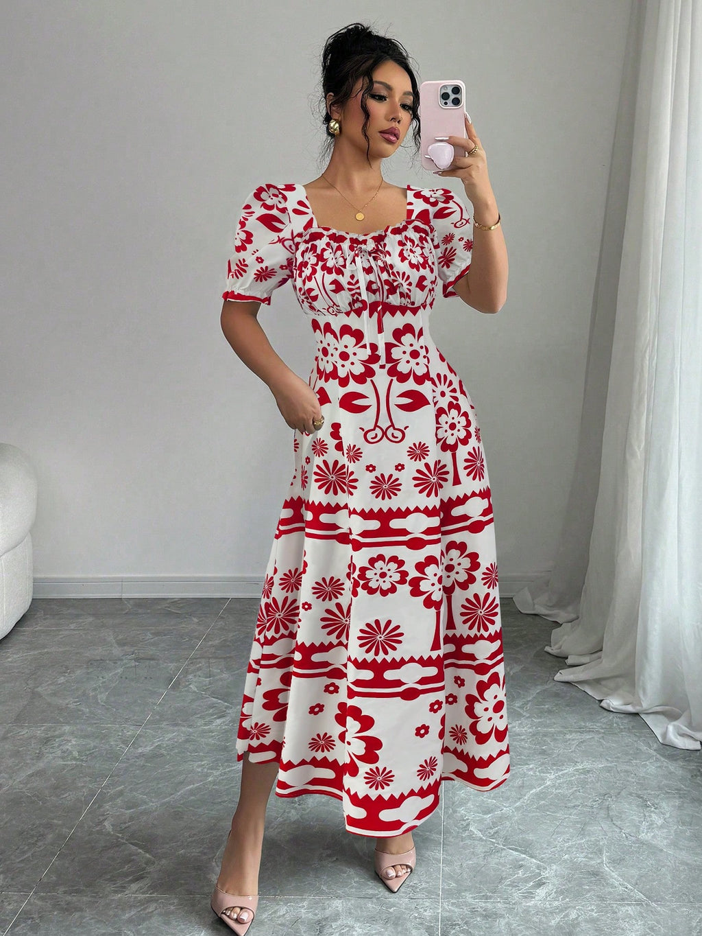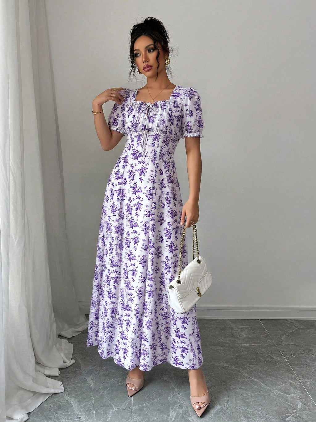 MIU AZRA Ženska Crna Crep Haljina sa Nabranom Ovratnikom i Rukavima u Zvonu